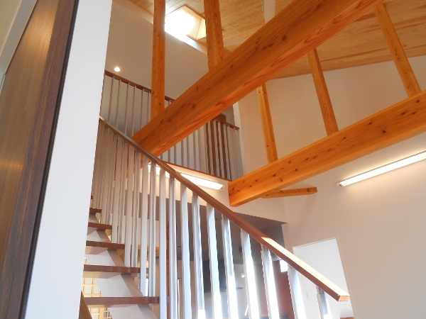 階段は、露出型階段(ストリップ階段とも呼ばれています)にして開放的にしてあります。 施工は
