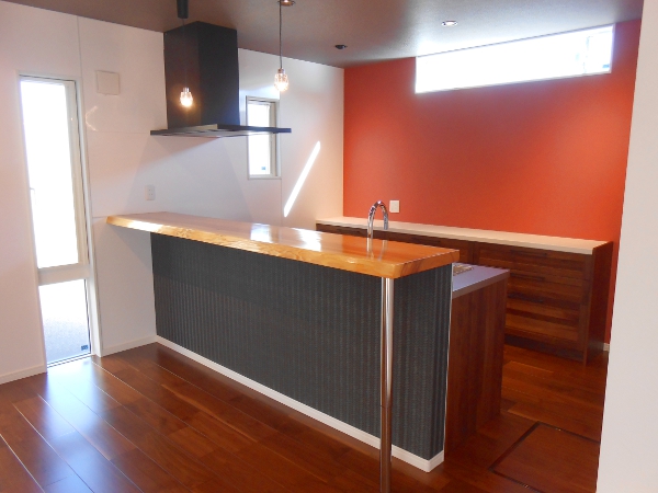 リビング ~ ダイニング ~ キッチンと続く 床板は、世界三大銘木のひとつ ウォールナット です。ずっりとした重厚感があります。