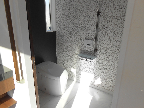 先進技術が集約されたタンクレス洋式便器・ステンレス鏡面仕上の手摺・ガラス棚付メッキの紙巻器が見えます。