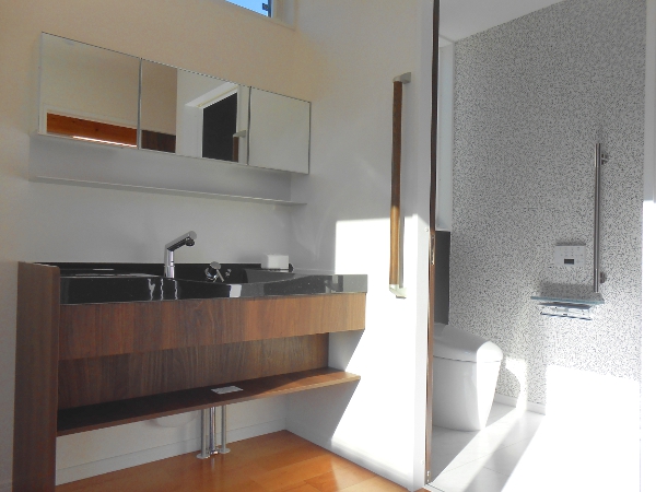 上質な洗面です。ブラック系の人造大理石一体カウター と ウォールナット調の組合せです。(パナソニック様 ラシス)