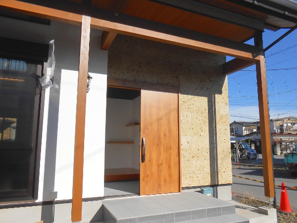 玄関のサッシ部外壁は 大谷石張りです。施主様が自分で施工しました。自ら自分の家に手をかける 愛着も増すここと思います。